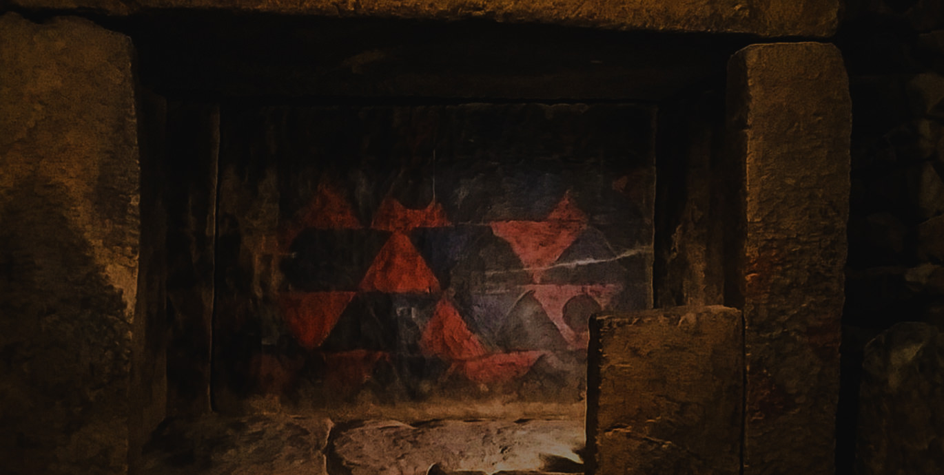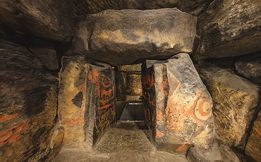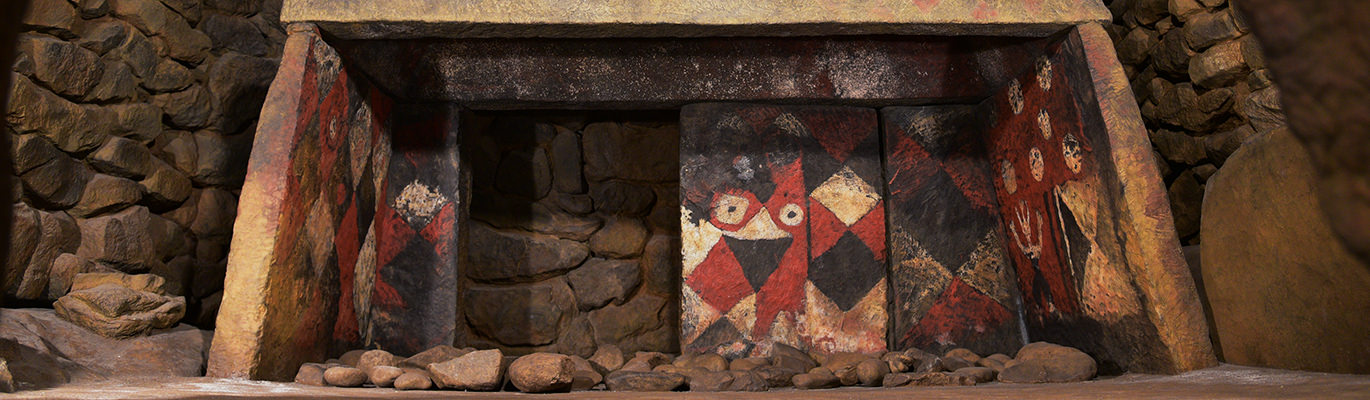 6世紀に入り、北部九州では壁画系の装飾古墳が数多く造られ始めます。この特徴は横穴式石室の壁面に彩色で装飾文様を描くことです。熊本では6世紀前半頃から円文や連続三角文を石室に描く様になります。また、武具や人物、馬など、絵画的な装飾も描かれます。