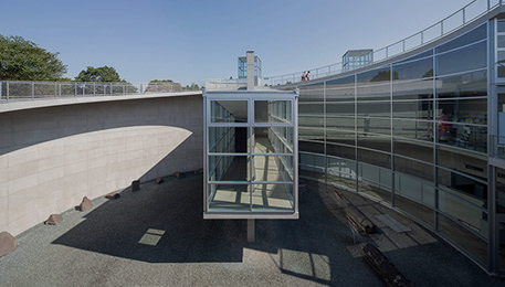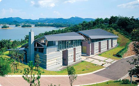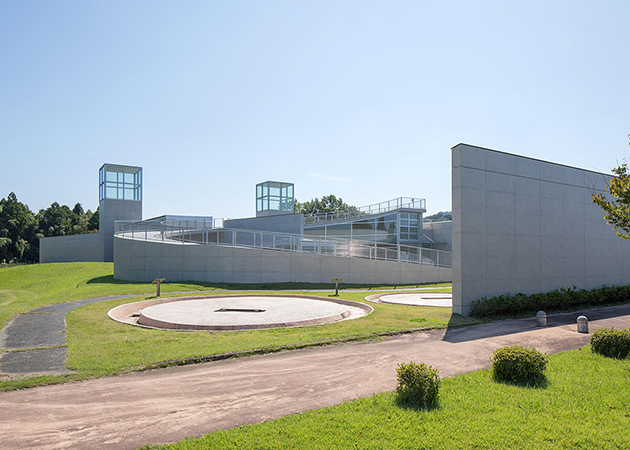 当館は、建築家安藤忠雄氏の作品です。前方後円墳の形を模しており、敷地内の岩原古墳群にある熊本県最大級の前方後円墳「岩原双子塚古墳」と点対称で向いあうように建てられています。