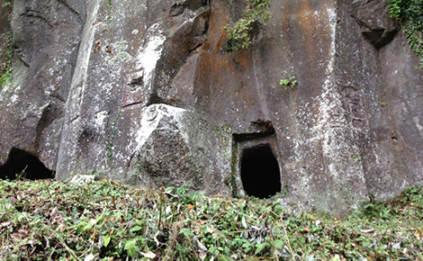 6世紀頃から、熊本では多くの装飾を持つ横穴墓が造られます。墓室の中だけでなく、入口付近の壁面にも装飾が描かれます。人物、靫、盾などが浮彫で描かれたり、彩色で円文や三角文が描かれたりします。