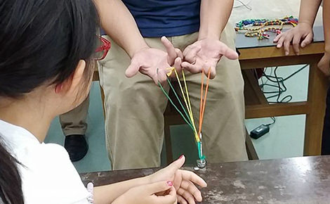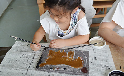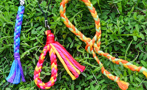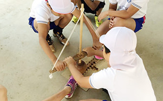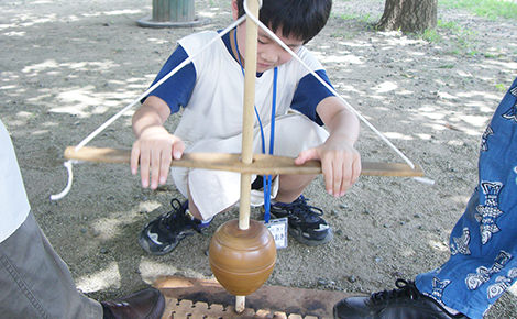 各団体様から依頼を受け、現地に赴いて行う体験教室です。「古代勾玉づくり」、「古代火おこし」、「古代組紐づくり」ができます。